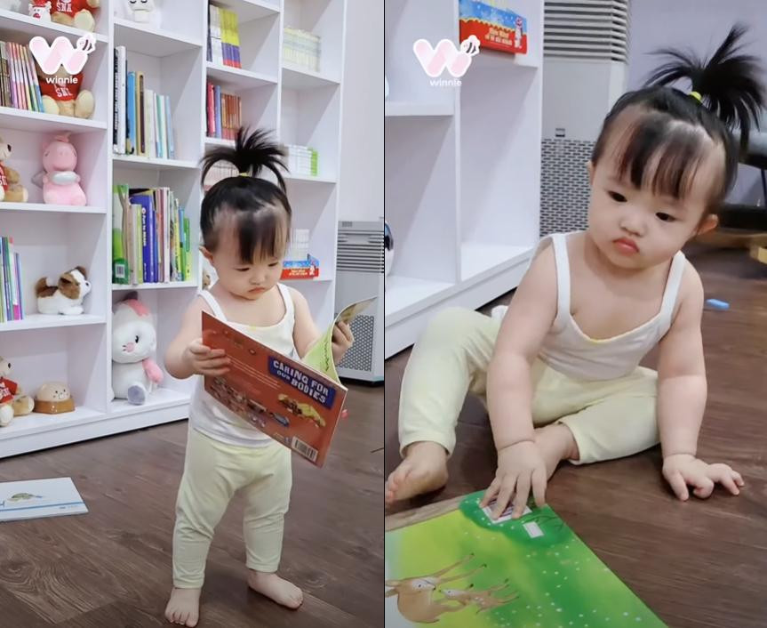 Bên cạnh đó, con gái Đông Nhi còn có niềm yêu thích đặc biệt với sách vở. Trong clip, bé Winnie tự đi đến kệ sách và lấy ra những quyển sách yêu thích để "nghiên cứu", học tập. Không những thế, cô bé cũng thừa hưởng đam mê âm nhạc từ bố mẹ. Đông Nhi cho biết ngay từ khi mới vài tháng tuổi, con gái đã thích nghe nhạc thiếu nhi. Cô bé hào hứng quơ tay quơ chân và nhún nhảy mỗi khi nghe tiếng nhạc vang lên.