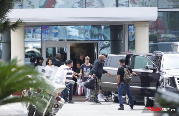 Andrew Taggart (quần xám, giày đỏ) cầm hành lý bước ra siêu xe đã được Phillip Nguyễn bố trí chờ sẵn.