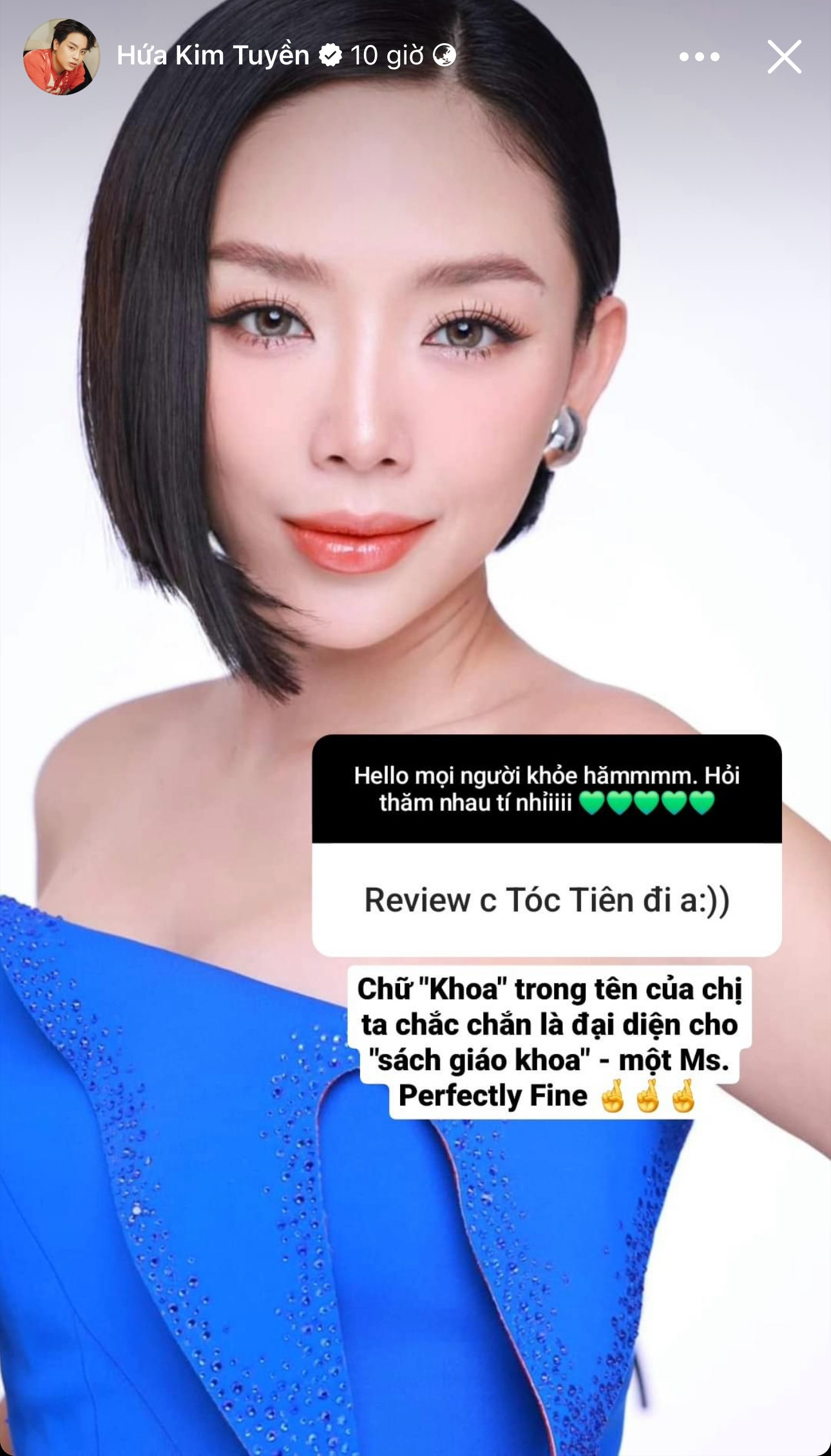 Bên cạnh Văn Mai Hương, Hứa Kim Tuyền cũng có một người "chị em ruột... thừa" vô cùng ăn ý - nữ ca sĩ Tóc Tiên. Bộ đôi nhạc sĩ - ca sĩ này đã không ít lần "gây bão" V-Pop với những ca khúc như Hôm Nay Tôi Cô Đơn Quá, Nếu Anh Là Em, mang ghế ra sân ngồi hát,... Đối với nam nhạc sĩ, Tóc Tiên là một "Mrs. Perfectly Fine" (tạm dịch: Quý cô hoàn hảo). Bên cạnh đó, anh cũng không quên "nửa đùa nửa khen" về vốn hiểu biết của đàn chị khi cho rằng "chữ Khoa trong tên của chị ta chắc chắn là đại diện cho sách giáo khoa".
