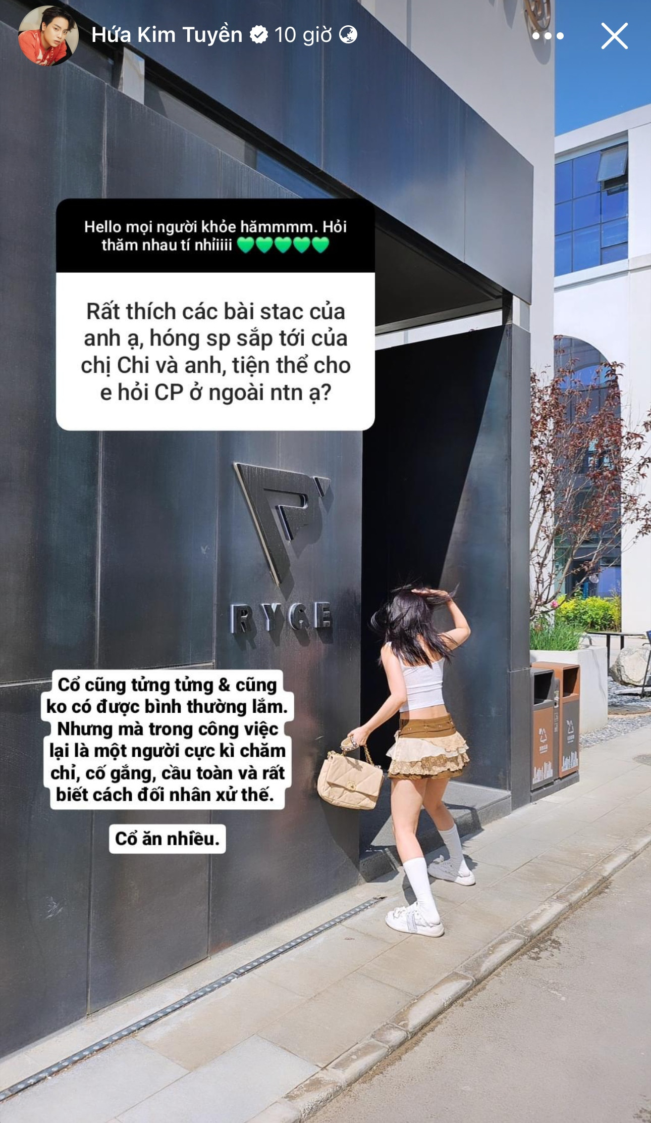 "Rì-viu" về người bạn cực kỳ "hợp cạ" trong âm nhạc, Hứa Kim Tuyền nhận định giọng ca Cầu Hôn là "chill nhất showbiz". Nam nhạc sĩ cũng bật mí Văn Mai Hương là một người cực sành ăn khi "có danh sách món ăn bao ngon, bao lên kí ở khắp mọi miền Tổ quốc và ngoại quốc, kèm theo công thức giảm cân nhanh như chớp".