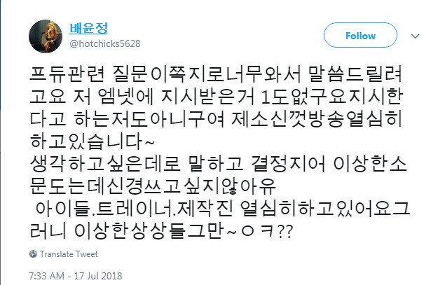 Vào ngày 17/7 vừa qua, huấn luyện viên Bae Yoon Jung đã tweet một dòng trạng thái khá dài trên trang Twitter cá nhân gửi đến cộng đồng mạng với nội dung khẳng định tin đồn cô bị Mnet dẫn dắt và thao túng là không hề có thật.