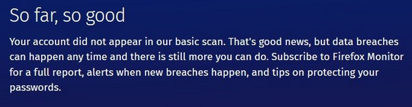 Nếu kết quả trả về là “So far, so good” nghĩa là cho đến nay tài khoản email của bạn không nằm trong danh sách những email đã bị xâm nhập cũng như các dịch vụ sử dụng tài khoản email này cũng chưa từng bị hacker tấn công, chiếm đoạt.