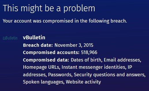 Ngược lại, nếu kết quả hiện ra là “This might be a problem” nghĩa là tài khoản email của bạn đã từng xuất hiện trong danh sách những email mà hacker chiếm đoạt hoặc một trang web nào đó mà bạn sử dụng email này để đăng ký đã từng bị hacker tấn công, lấy cắp cơ sở dữ liệu người dùng. Firefox Monitor cũng sẽ liệt kê dịch vụ hoặc trang web nào mà bạn đã dùng email để đăng ký từng bị hacker tấn công trước đây để người dùng biết rõ.