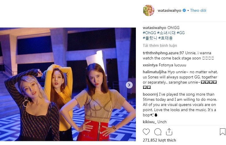 Vừa mới đây, Hyoyeon đã đăng tải trên Instagram một tấm hình chụp chung với Taeyeon và Yoona, như một cách giới thiệu nhóm Oh!GG. Cũng như mọi khi, rất nhiều fan đã vào thả tim, và khen ngợi các cô gái luôn trẻ trung xinh đẹp.