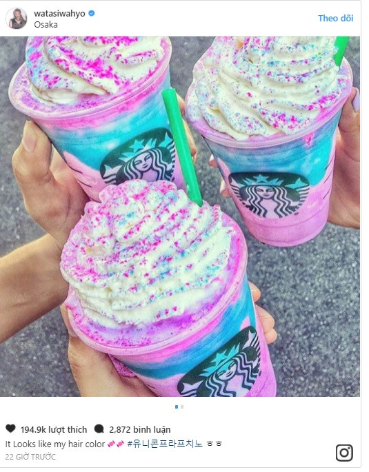 Bản thân Hyoyeon cũng nhận ra màu tóc của mình đã bắt kịp trào lưu ngựa kỳ lân đang khuynh đảo cả thế giới, nên phải mua ngay một ly Frappuccino kỳ lân của Starbucks cho hợp cảnh.