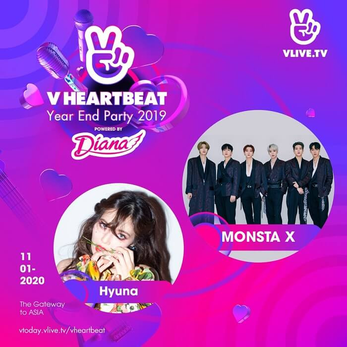 Sự kiện âm nhạc Việt - Hàn hoành tráng mỗi tháng của Vlive đã trải qua 1 năm tràn đầy thăng hoa và sự bùng nổ của các nghệ sĩ Vpop - Kpop. Đầu tháng 1 này, ban tổ chức sẽ mang đến cho khán giả một lễ hội đỉnh cao, vinh danh các nghệ sĩ đã và đang tham gia ứng dụng giải trí Vlive, đặc biệt là các nghệ sĩ đã mở câu lạc bộ fan online toàn cầu Fanship. Với tên gọi V Heartbeat Year End Party 2019 Powered By Diana, sự kiện giống như lễ hội cuối năm 2018 với hai phần chính: Lễ trao giải V Live Awards và V Heartbeat.