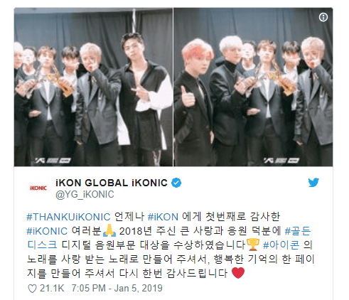 Sau đó, iKON cũng đã lên Twitter và Instagram để cảm ơn người hâm mộ của họ một lần nữa.