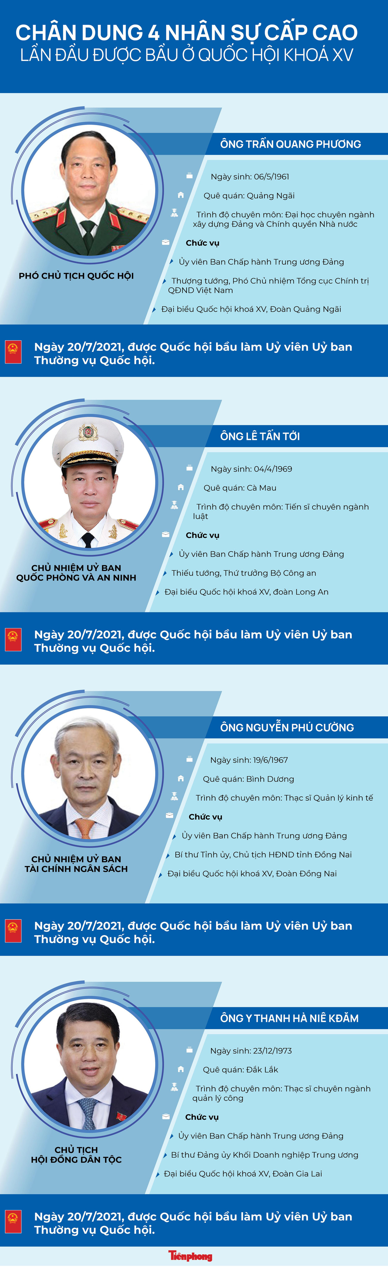 TPO - Thượng tướng Trần Quang Phương, Thiếu tướng Lê Tấn Tới, Bí thư Tỉnh uỷ Đồng Nai Nguyễn Phú Cường và Bí thư Đảng ủy Khối Doanh nghiệp Trung ương Y Thanh Hà Niê Kđăm được bầu vào Uỷ ban Thường vụ Quốc hội, giữ các chức vụ quan trọng ở Quốc hội khoá XV.