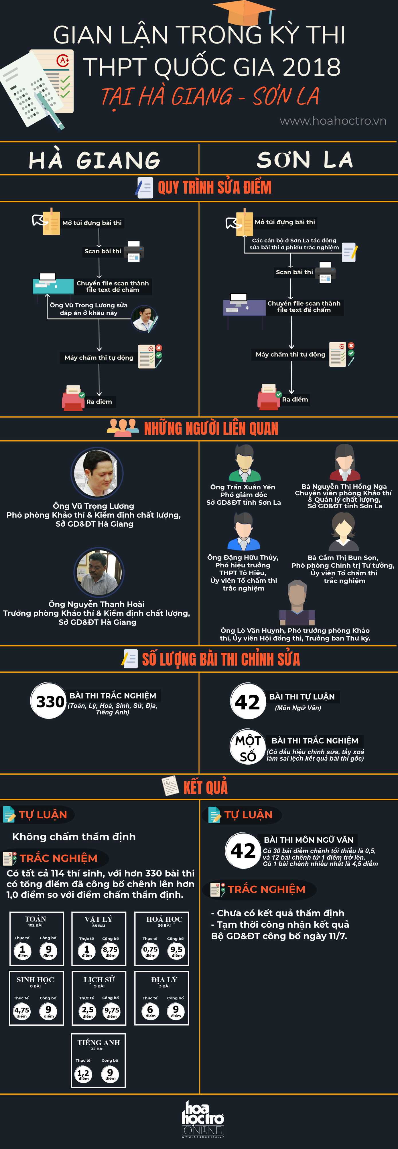 Hoa Học Trò Online gửi đến bạn đọc Infographic khái quát những thông tin liên quan đến hai vụ gian lận điểm thi tại Hà Giang và Sơn La gây "chấn động" dư luận thời gian gần đây: