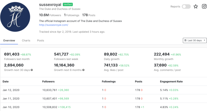 Cụ thể, vào ngày 8/1, thời điểm vợ chồng Hoàng tử Harry – Meghan công bố quyết định rút lui khỏi hoàng gia Anh, Instagram của cặp đôi có 10 triệu người theo dõi. Tuy nhiên, chỉ sau 4 ngày, số người theo dõi Instagram của cặp đôi đã tăng thành gần 11 triệu, sức hút chẳng kém gì các ngôi sao Hollywood.