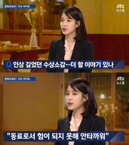 IU trải lòng mình: "Anh ấy ra mắt cùng thời điểm với em. Là một đồng nghiệp mang trong mình những giấc mơ giống em, và anh ấy cũng có những suy nghĩ, lo lắng cố gắng để tiến bộ tương tự như em. Thế nên em đã rất hối tiếc vì em đã không tiếp thêm sức mạnh cho anh ấy. Em nghĩ các nghệ sĩ khác cũng đang cảm thấy nặng trĩu. Thời điểm đó có rất nhiều lễ trao giải vào cuối năm, và em thật sự không mong muốn ai phải chịu đau đớn, hay phải lên sân khấu với một đôi vai nặng trĩu. Em hi vọng sự chân thành sẽ luôn được lan tỏa”.