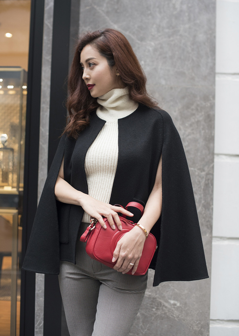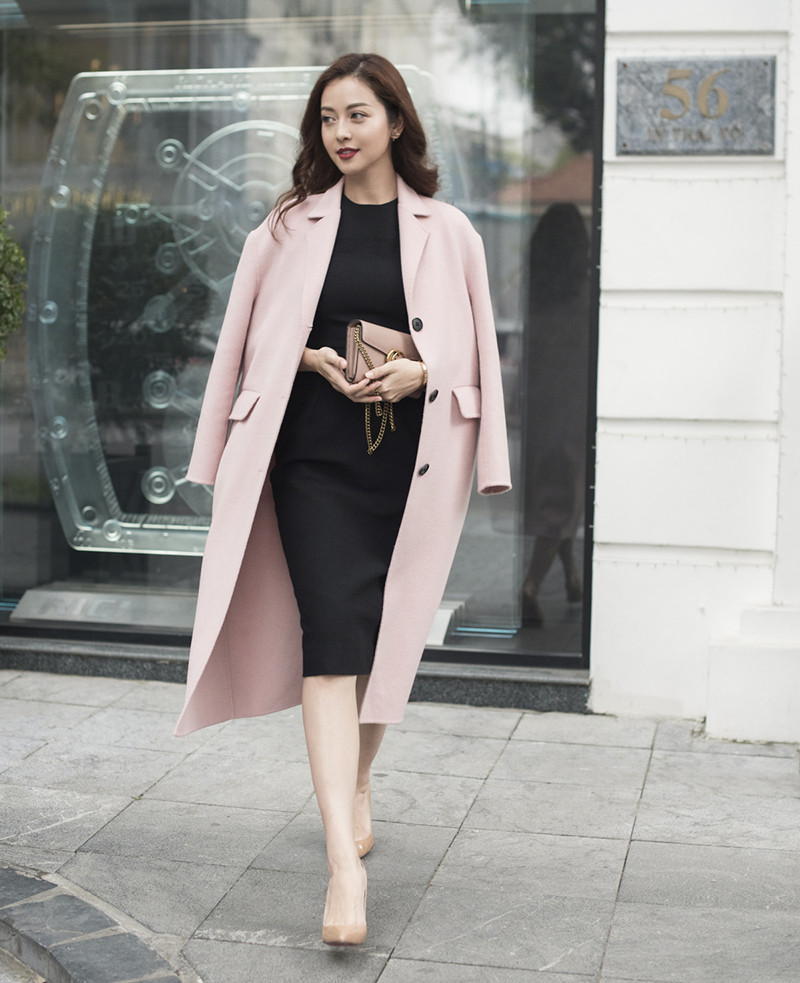 Kết hợp chiếc váy đen cùng chiếc áo khoác dài, Jennifer Phạm vừa bí ẩn lại vừa nữ tính. Trên đường đua phong cách, Jennifer Phạm được đánh giá cao bởi những sự kết hợp chuẩn xác.