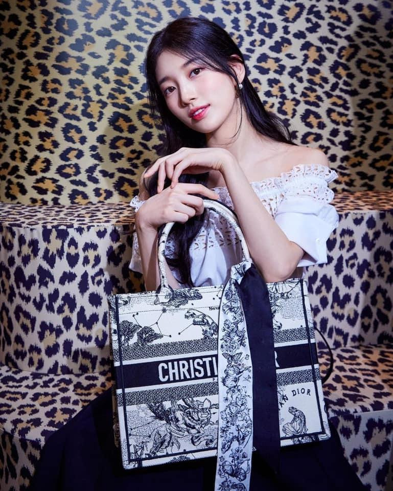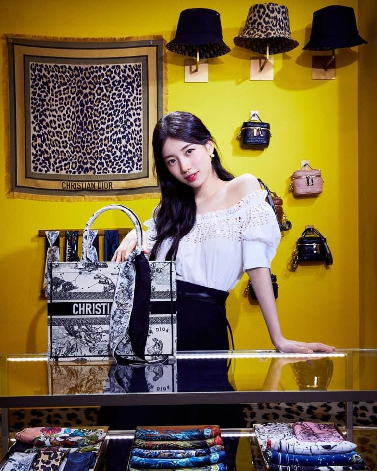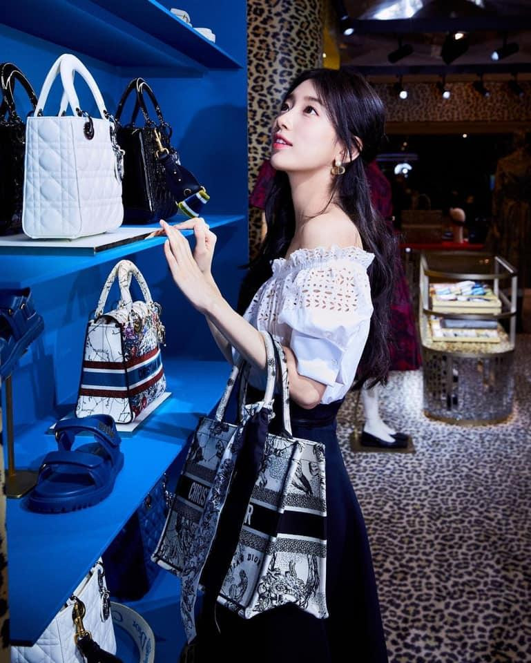 Trước đó ít lâu, Suzy cũng đã ghé qua pop-up store của Dior. Suzy chọn cho mình tạo hình rất nữ tính, trong trẻo với áo ren trễ vai cùng chân váy chữ A và thả tóc xõa.
