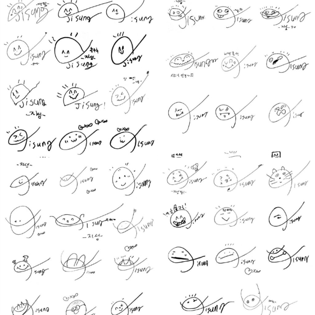 Chữ ký ban đầu của Jisung đã rất sáng tạo, khi chữ J được biến tấu thành một khuôn mặt cười rất đáng yêu, vui nhộn. Ấy thế mà Jisung còn tiến xa hơn nữa, khi anh chàng chịu khó tô điểm cho khuôn mặt ấy nhiều biểu cảm khác nhau từ vui vẻ đến cáu kỉnh, không cái nào giống cái nào. Thậm chí Jisung còn vẽ thêm tai, thêm thân người, thành con mèo, con thỏ, thành quái vật… vô cùng ngộ nghĩnh.