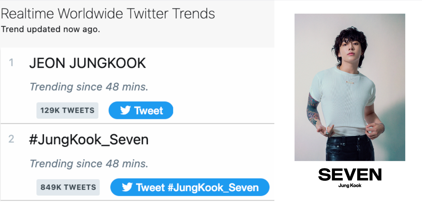 Không thể nghi ngờ sức hút của Jung Kook, chỉ vài phút sau khi những hình ảnh trên được phát hành, các từ khóa liên quan đã ngay lập tức leo lên dẫn đầu Top xu hướng toàn cầu của Twitter.