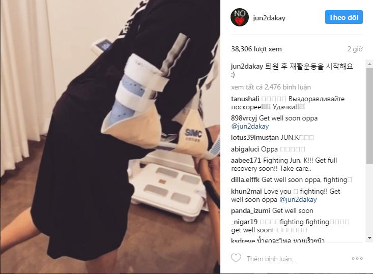 Mới đây Jun.K đã cập nhật tình hình sức khỏe của mình lên trang cá nhân để trấn an người hâm mộ. Jun.K đã phải trải qua phẫu thuật khuỷu tay phải bị gãy và có vẻ nam thần tượng còn bị chấn thương ở phần ngực và đầu gối.