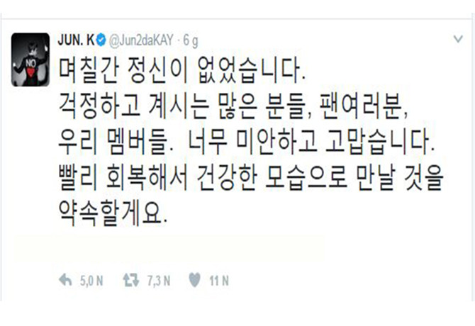 Sau đó, dù JYP Ent và cả Jun.K đã thông báo tình hình sức khỏe của anh chàng không có gì quá đáng ngại và Jun.K sẽ tiếp tục được theo dõi và điều trị tại bệnh viện, nhưng nỗi lo của các fan vẫn còn thường trực.