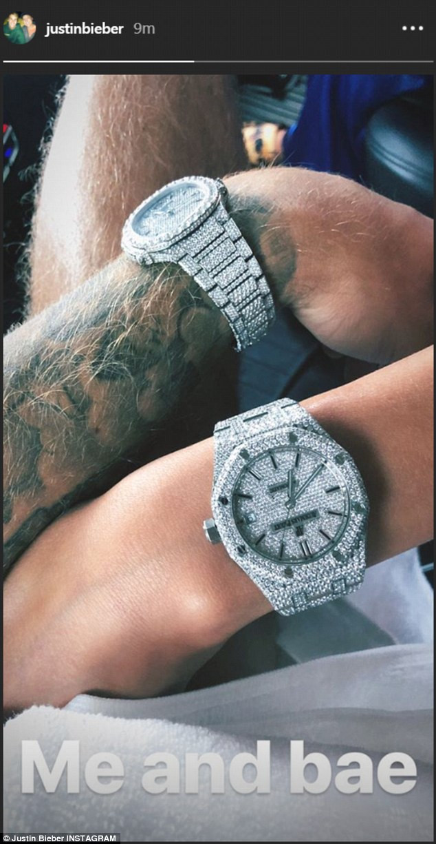Cụ thể, trên Instagram, Justin Bieber vừa khiến fan phải “mắt tròn, mặt dẹt” khi thể hiện tình cảm với vị hôn thê Hailey Baldwin bằng hai chiếc đồng hồ đôi đính kim cương. Được biết mỗi chiếc có giá trị 140.000 USD (hơn 3,1 tỷ đồng), hai chiếc đồng hồ được cho là của thương hiệu Audemars Piguet. Nam ca sĩ 24 tuổi ghi còn đính kèm dòng chú thích: "Tôi và em" để chứng minh rằng tình cảm của họ vẫn đang vô cùng mặn nồng.