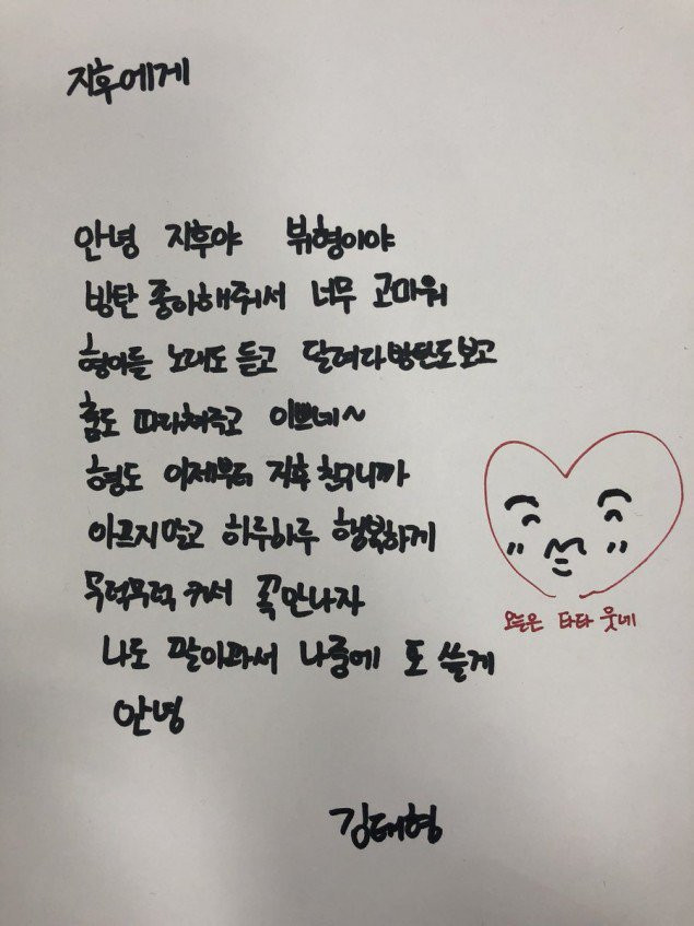 Ngoài ra, Jihoo cũng bật mí rằng em thích V nhất trong cả nhóm. Thế nên Jihoo đã vẽ hình Tata (nhân vật mà V tham gia sáng tạo trong một bộ sản phẩm) cùng với dòng chữ “Em hy vọng Tata có thể mỉm cười”. Jihoo than thở rất muốn viết thêm cho BTS nhưng vì quá mỏi tay, nên phải ngừng ở đây.