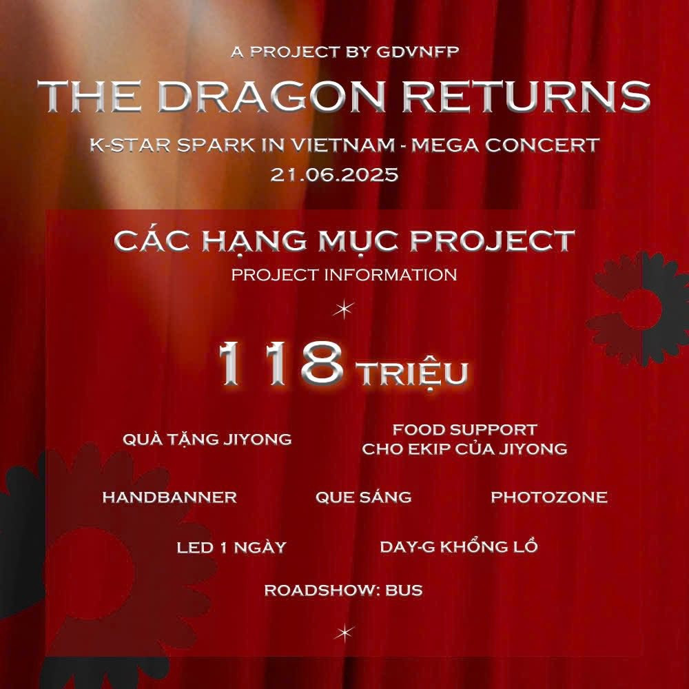 Với mức quỹ này, Chí Long Vietnam Fanpage sẽ chuẩn bị quà tặng cho G-Dragon, quà tặng cho ekip, hand-banner, que sáng, photozone tại địa điểm tổ chức, chạy LED quảng bá, mang tới mô hình DAY-G khổng lồ, roadshow xe buýt dán decal quảng bá.