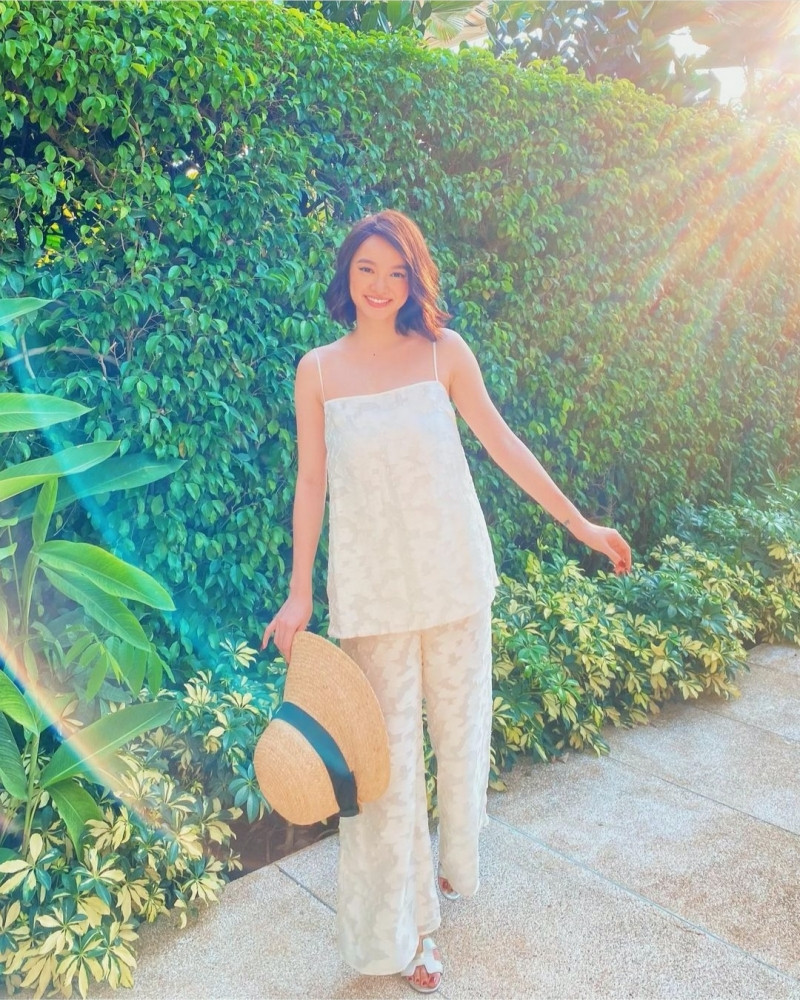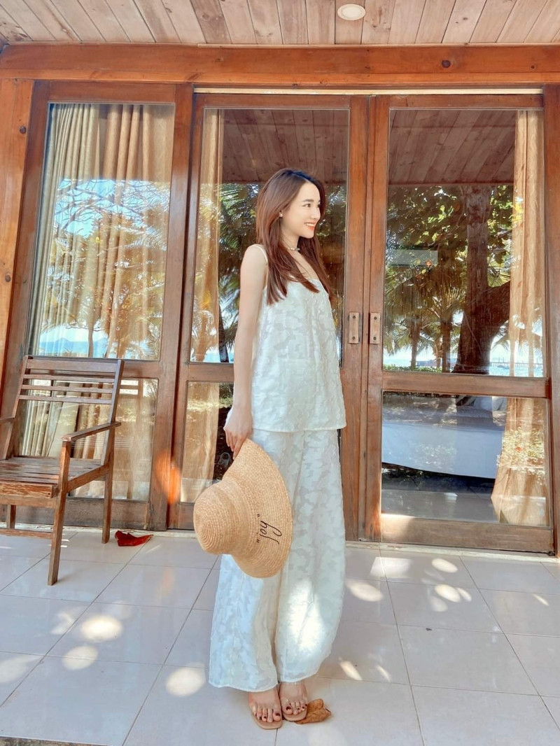 Hiền Hồ cũng gây thương nhớ với set trang phục màu trắng có thiết kế kết hợp áo hai dây và quần ống rộng tương tự, cô nàng ghi điểm vì độn nón lá và xách túi cói dễ thương.