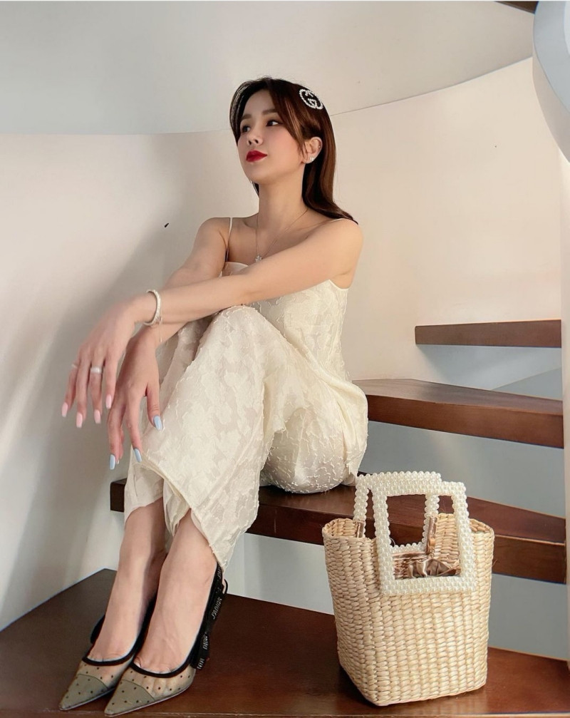 Diệp Lâm Anh cũng từng diện set trang phục siêu hot này, cô nàng mang giày cao gót Dior và xách túi cói đính ngọc độc đáo.