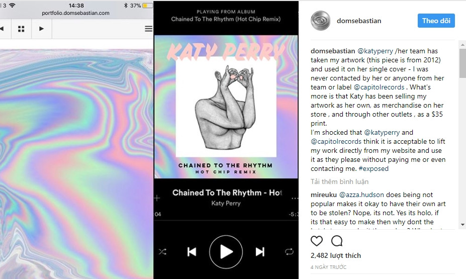 Không những thế Katy Perry cũng từng tự ý bán tác phẩm của tôi trong các cửa hàng, với giá 35 USD/ bức (800.000 VNĐ). Tôi rất sốc khi Katy Perry và công ty @capitolrecords nghĩ họ được phép lấy trực tiếp tác phẩm của tôi từ website và cứ thế dùng mà không thèm trả tiền hay thậm chí là liên lạc với tôi”.