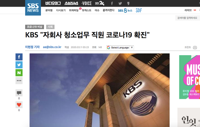 Cũng theo báo cáo, nhân viên A này và 11 người khác làm việc tại trụ sở chính của đài KBS ở Seoul, Hàn Quốc đã nộp đơn nghỉ để thực hiện cách ly kiểm dịch. Ngay sau đó, một số tầng của tòa nhà đã đóng cửa trong vòng 24 tiếng để khử trùng. Toàn bộ nhân viên được lệnh phải làm việc tại nhà cũng như tự cách ly bản thân.