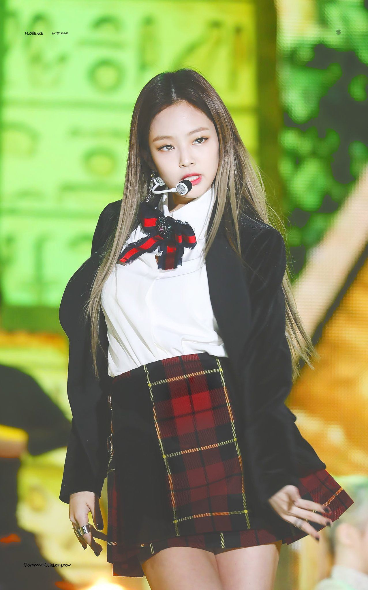Cũng là set đồ sơ mi trắng và chân váy, nhưng Jennie lại chọn tông màu trầm hơn, để chiếc nơ trở thành điểm nhấn chủ đạo.