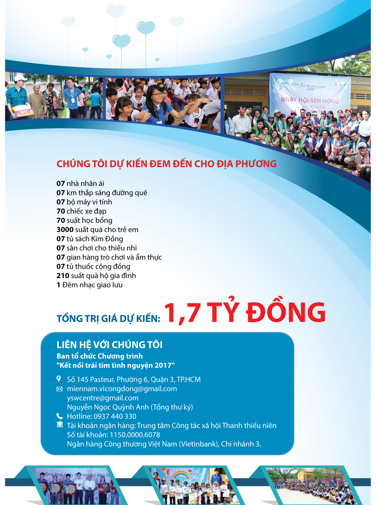 Chương trình“Kết nối trái tim tình nguyện 2017 thu hút trên 500 tình nguyện viên tham gia. Chương trình được tổ chức nhằm tạo sân chơi lành mạnh, an toàn, bổ ích và thiết thực cho các CLB, Đội, Nhóm, Công tác xã hội và các cơ sở Đoàn. Đây là cơ hội giao lưu, học hỏi, chia sẻ các mô hình hoạt động tình nguyện vì lợi ích cộng đồng. Chương trình nhằm tạo phong trào, kích thích sự tham gia và sáng tạo của Thanh niên địa phương từ các mô hình tình nguyện tự lực.