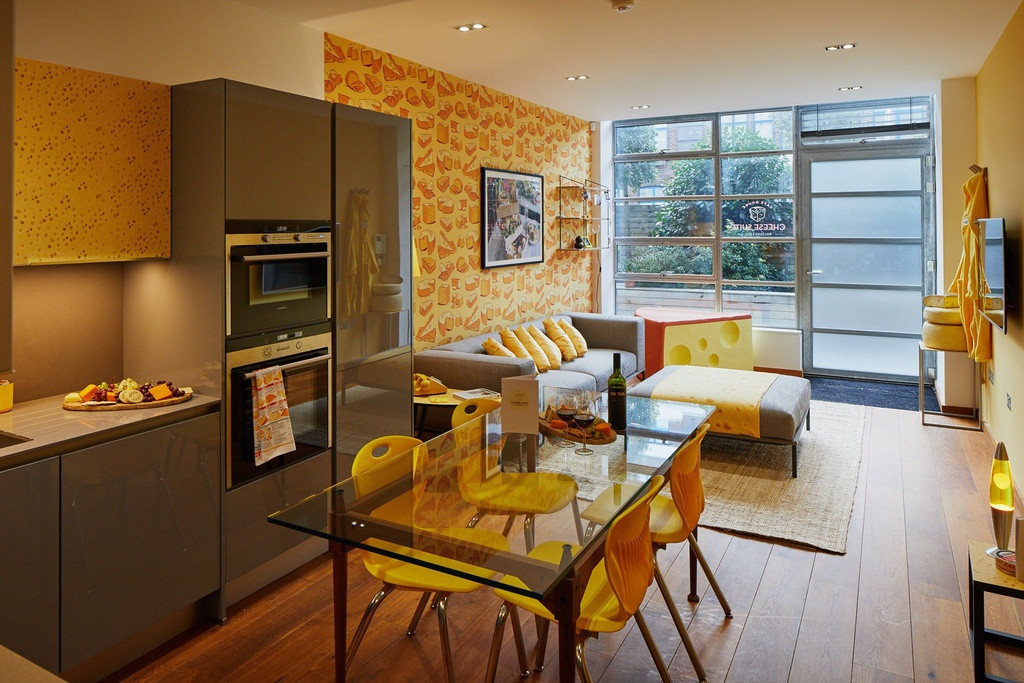 Khách đến thị trấn Camde (London, Anh) trong thời gian này có cơ hội trải nghiệm chuyến du lịch một cách độc đáo, khác biệt trong căn phòng khách sạn Cheese Suite. Nơi này sử dụng gam màu vàng nổi bật và được trang trí theo chủ đề phô mai từ bức tường, ghế sofa, giường ngủ đến phòng tắm.