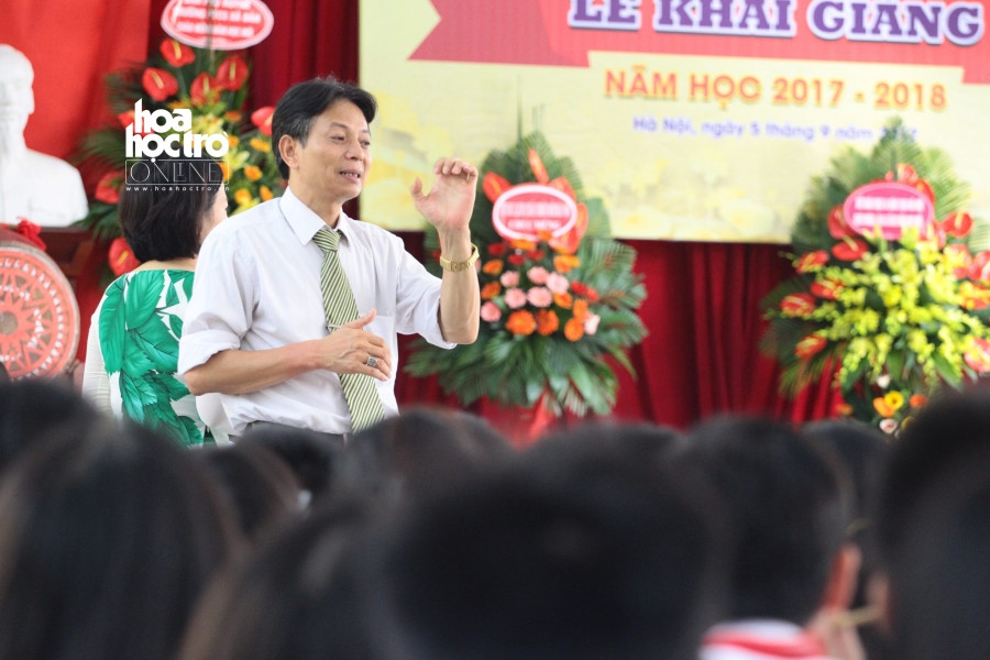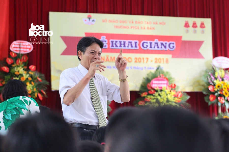 Trong khi thầy Hiệu trưởng phát biểu, luôn có một thầy giáo dùng ngôn ngữ ký hiệu để giới thiệu lại cho các em học sinh đang ngồi phía bên dưới.