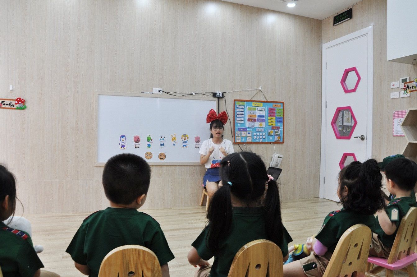 Các bạn nhỏ vô cùng hứng thú khi được học English Doo trong buổi đầu tiên đi học.