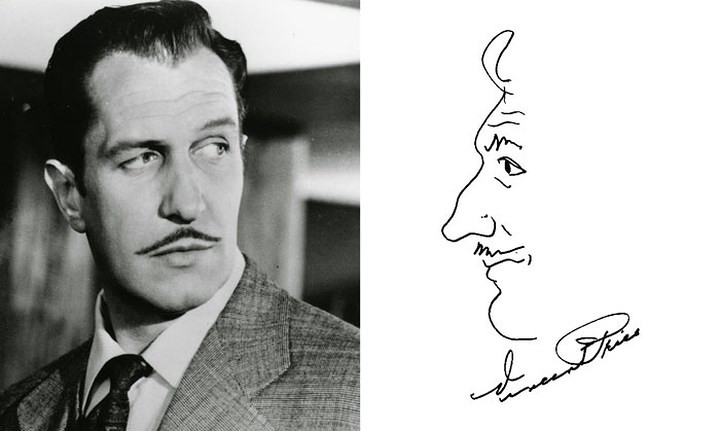 Nam diễn viên Vincent Price vẽ chân dung mình trong chữ ký.