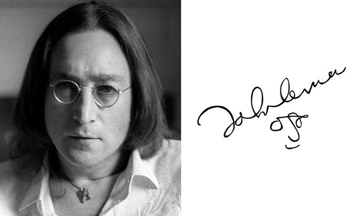 John Lennon - Ca sĩ người Anh, nhạc sĩ, nhà hoạt động hòa bình và đồng sáng lập The Beatles vẽ một bức chân dung tự họa đơn giản trong chữ ký.