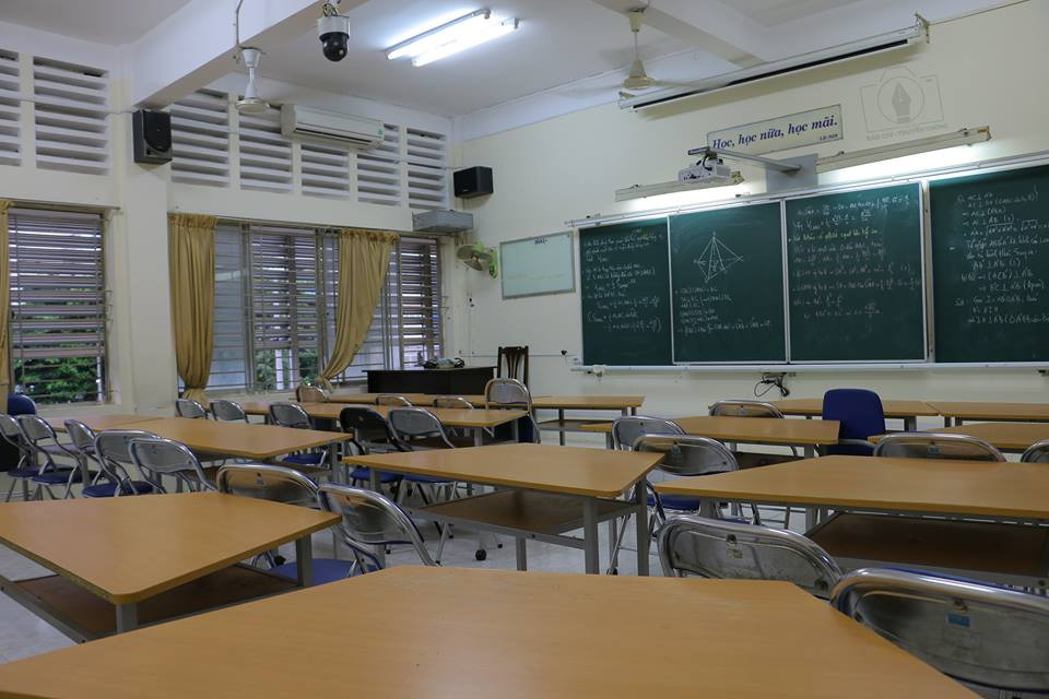 Lớp học được trang bị tiến tiến từ loa, máy chiếu, máy lạnh và có cả camera.