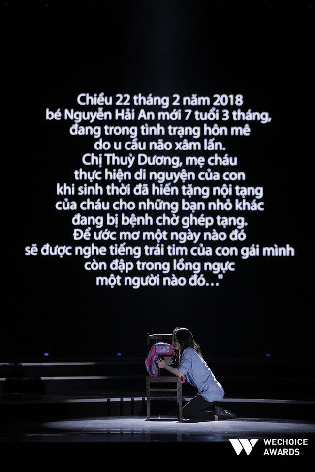 Ngồi dưới hàng ghế khán giả, chị Nguyễn Trần Thùy Dương - mẹ của Hải An nghẹn ngào, không nén nổi những giọt nước mắt. Những kỷ niệm về khoảng thời gian khó khăn trải qua cùng con gái được tái hiện trên sân khấu như một khúc phim quay chậm. Trên hành trình ấy, chị Dương vừa là chỗ dựa cho An về tinh thần, vừa cùng con lan tỏa đi thông điệp nhân văn về tình người.