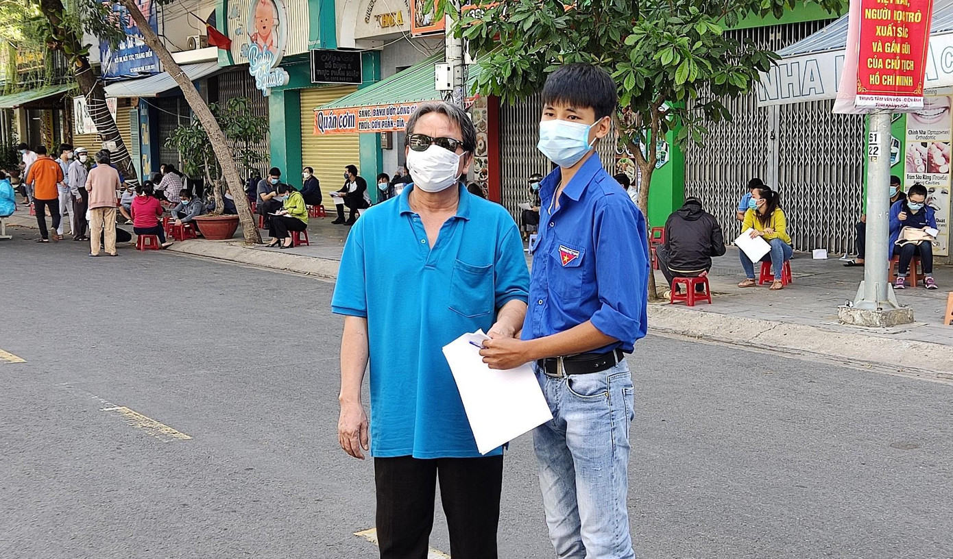 | Lực lượng thanh niên lấy thông tin điền vào tờ khai tiêm vắc-xin cho người khiếm thị. Ảnh L.H |