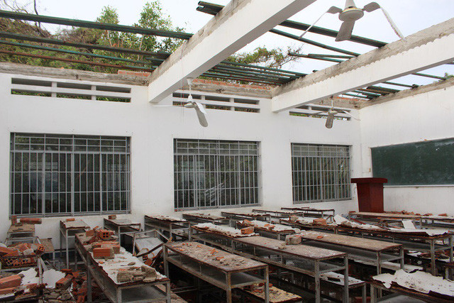 Phòng học sinh viên ở một khu giảng đường bị tốc mái, gây hư hỏng bàn ghế và các trang thiết bị bên trong.