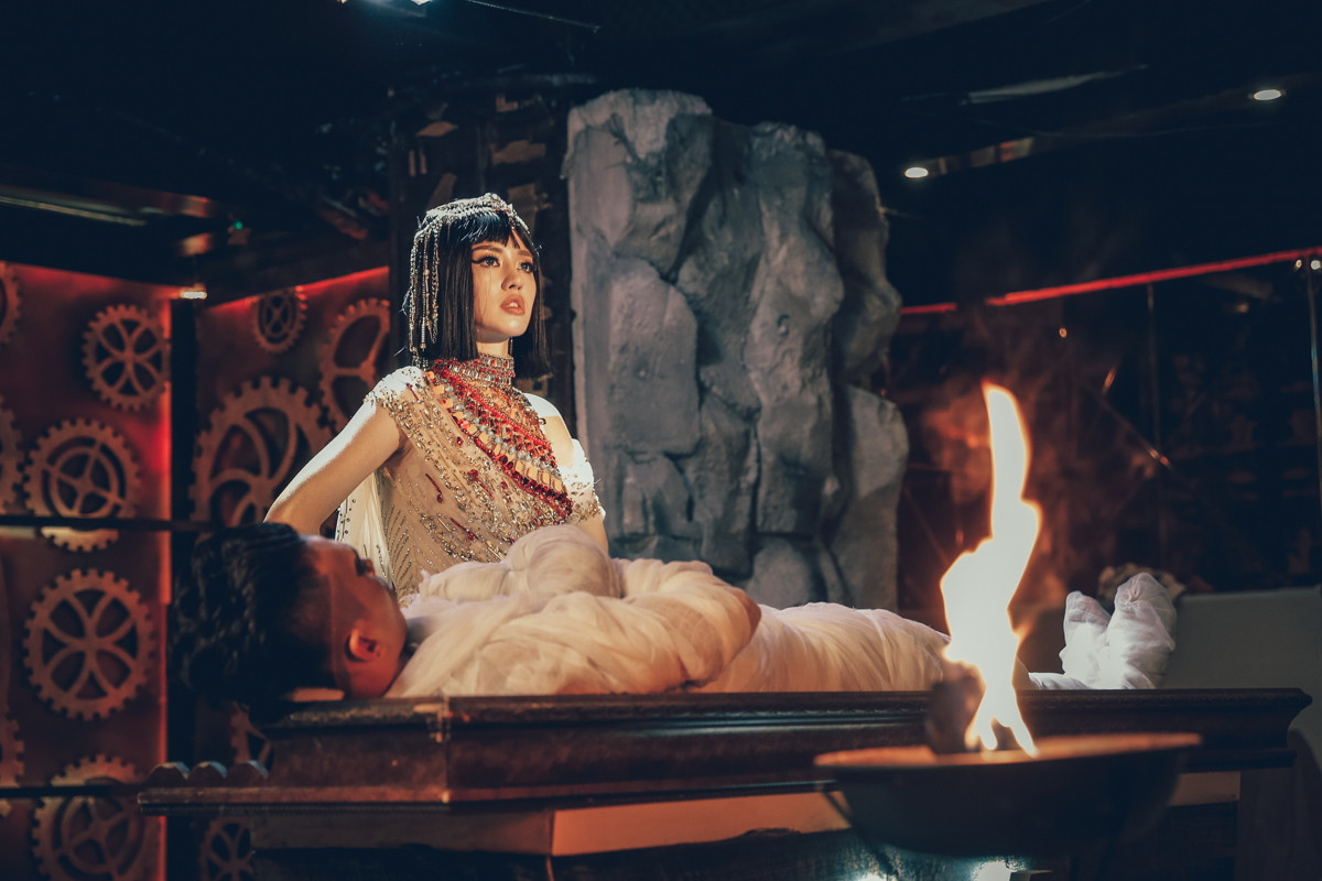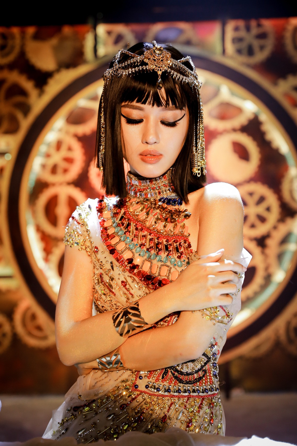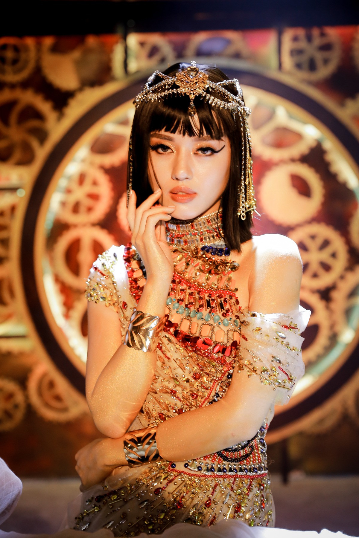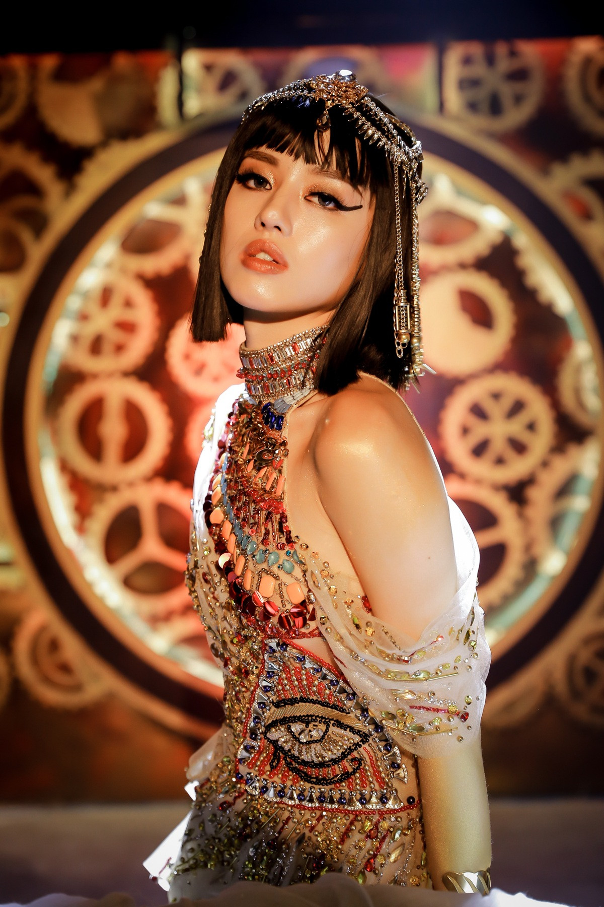 Trong những hình ảnh mới đầy biến hóa, Khánh Linh đã hóa thân thành Nữ hoàng Ai Cập quyền lực. Sở hữu khuôn mặt như búp bê không góc chết cùng vẻ đẹp mong manh, sắc sảo và cũng rất sang trọng, không có quá nhiều khó khăn khi Nữ hoàng Ai Cập Khánh Linh thể hiện hình ảnh gợi cảm cùng nhan sắc ấn tượng.