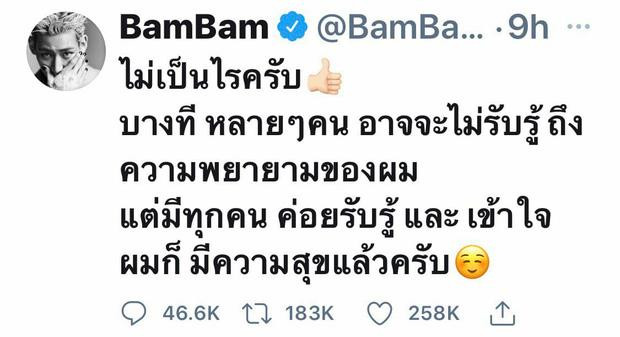 Sau sự việc, BamBam đã lên tiếng bằng tài khoản Twitter chính thức nhằm trấn an người hâm mộ. “Mình ổn mà. Nhiều người chưa công nhận sự cố gắng của mình. Nhưng các bạn biết và thấu hiểu là được. Mình hạnh phúc vì điều đó.”