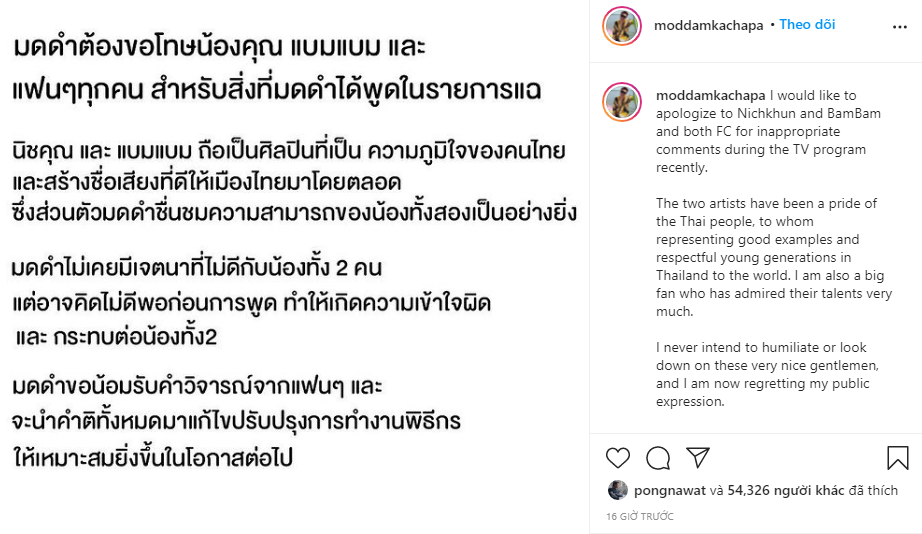 Sau cùng, dưới áp lực của dư luận, MC Moddam Kachapa đã đăng bài xin lỗi bằng tải khoản Instagram chính thức. Nam MC bày tỏ sự hối hận của mình vì những phát ngôn thiếu chừng mực trên sóng truyền hình, đồng thời mong muốn Nickhun, BamBam cùng cộng đồng người hâm mộ có thể tha thứ cho hành động của anh.