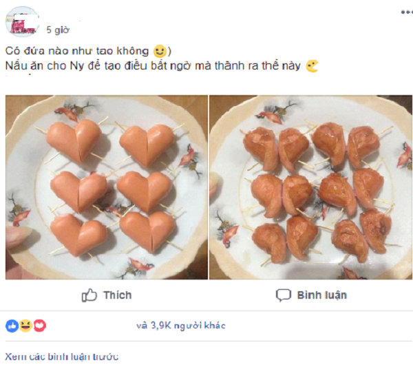 Dưới bài viết là bức ảnh trái ngược hoàn toàn trước và sau khi xúc xích trái tim được nướng. Nếu như trước đó, những miếng xúc xích được cắt tỉa xếp ngay ngắn thành hình trái tim tròn đều rõ nét thì sau khi rán, miếng xúc xích hình trái tim đã biến đâu mất dạng, cong queo và chẳng thành hình thù gì cả. Điều này khiến chàng trai vô cùng bối rối và xen chút thất vọng.