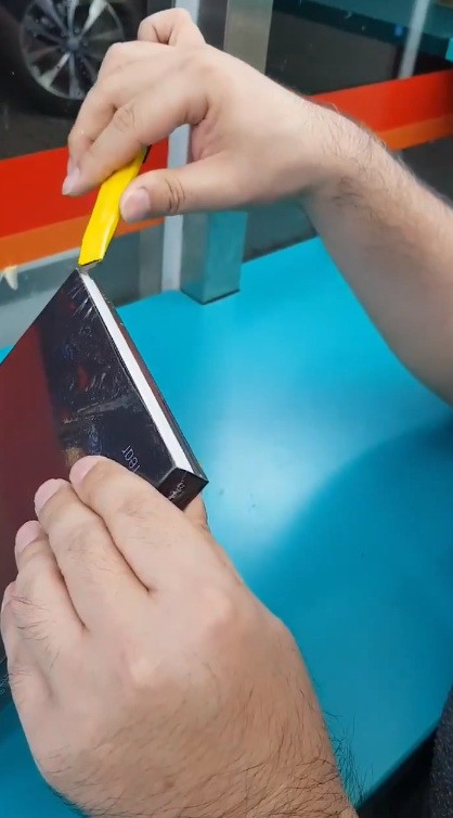 Dùng dao rọc giấy để tháo lớp bọc ngoài của album.