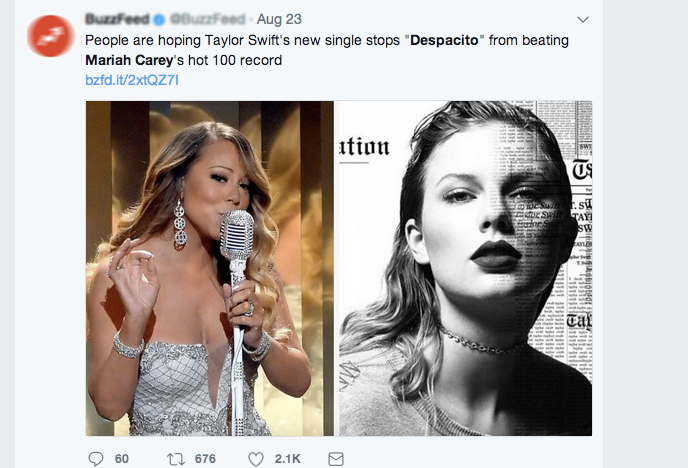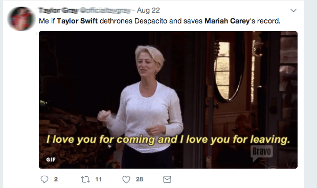 Và nếu Taylor Swift đạp đổ được Despacito thì sẽ là một món quà tuyệt vời dành tặng Mariah Carey.