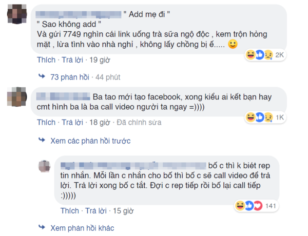 Kết bạn Facebook với bố mẹ, sau đó là những chuyện ngộ nghĩnh hài hước xuất hiện từ việc đăng trạng thái, đăng hình, nhắn tin, sử dụng nhãn dán. Sẽ có nhiều lắm những lần bố mẹ gửi cho mình một đống thứ và "mẹ thử thôi" nhưng cũng có những phụ huynh chọn cách học từ lý thuyết căn bản rồi mới thực hành.