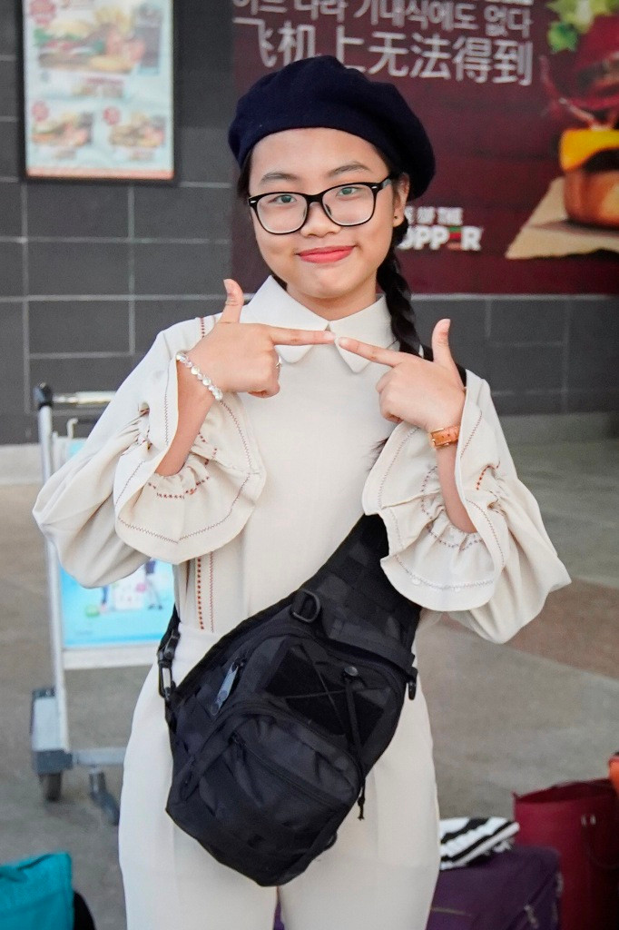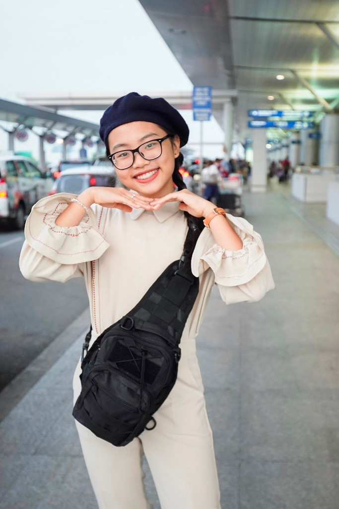Sáng sớm 11/5, Phương Mỹ Chi cùng mẹ có mặt tại sân bay Tân Sơn Nhất, TP.HCM để lên đường sang Mỹ lưu diễn theo lịch trình đã lên từ trước. Á quân Giọng hát Việt nhí mùa đầu tiên gây chú ý khi diện trang phục cá tính, khác hẳn hình ảnh dịu dàng thường thấy.