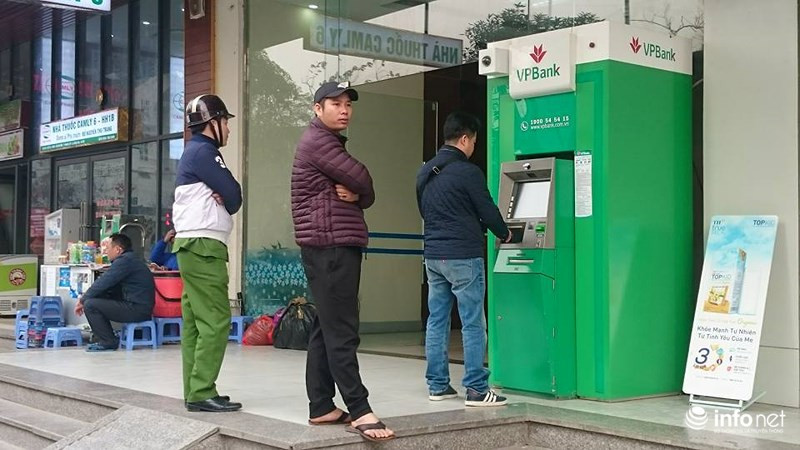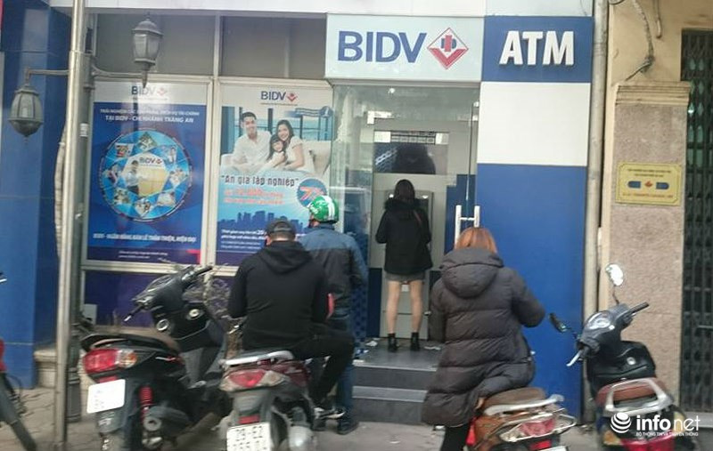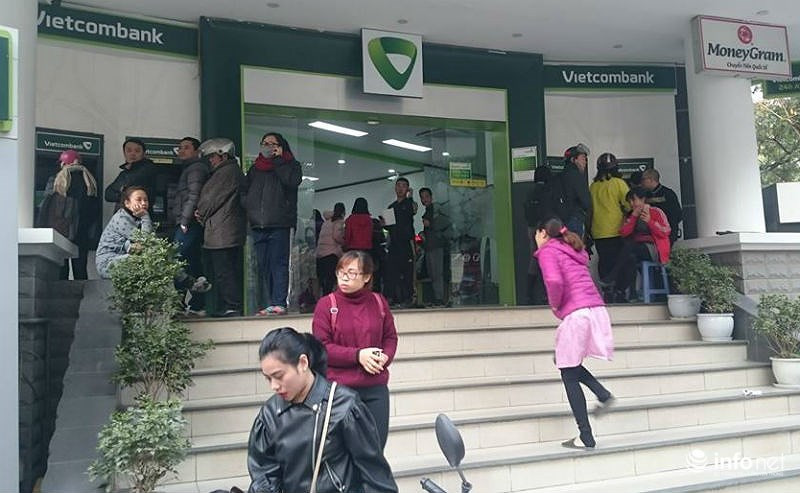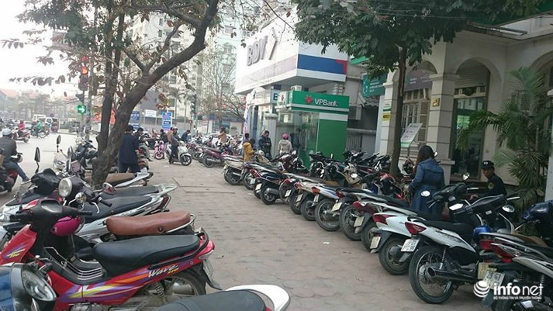 Cũng trong chiều 24 tháng Chạp, hai phòng giao dịch của hai ngân hàng BIDV và VPBank Bắc Linh Đàm cũng diễn ra cảnh tương tự là phải xếp hàng để rút tiền. Lượng người đến giao dịch bên trong chi nhánh ngân hàng cũng khiến cho vỉa hè trước hai PGD đỗ kín xe gắn máy.