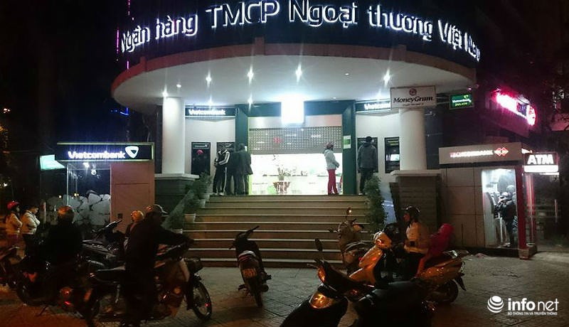 Đông đúc nhất phải kể đến ATM của Vietcombank, bên trong khách hàng chờ giao dịch, ngoài sân khách hàng xếp hàng chờ đến lượt rút tiền.