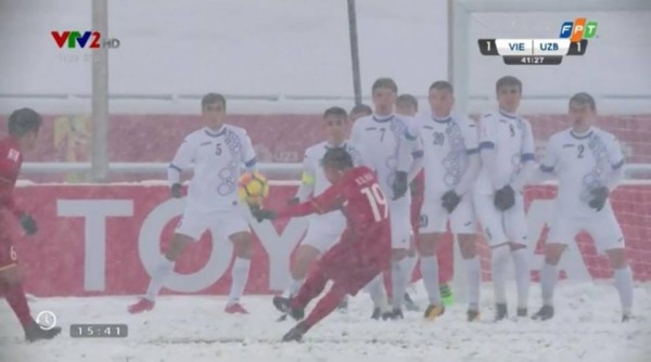 Nhưng dường như khó khăn đó cũng không làm cản bước sự quyết tâm của các chàng trai U23 Việt Nam. Bằng một cú sút phạt ”thần thánh”, Quang Hải đã gỡ hòa 1:1, đem lại niềm hy vọng gấp bội cho toàn thể người dân Việt Nam. Và để làm nên bàn thắng đó, không thể kể đến sự hết mình của đồng đội, khi Văn Thành cùng các cầu thủ đã chạy ra sân ”cào sạch tuyết” để Quang Hải có thể sút bóng dễ dàng. Khoảnh khắc này đã được cộng đồng mạng chia sẻ nhiệt liệt.